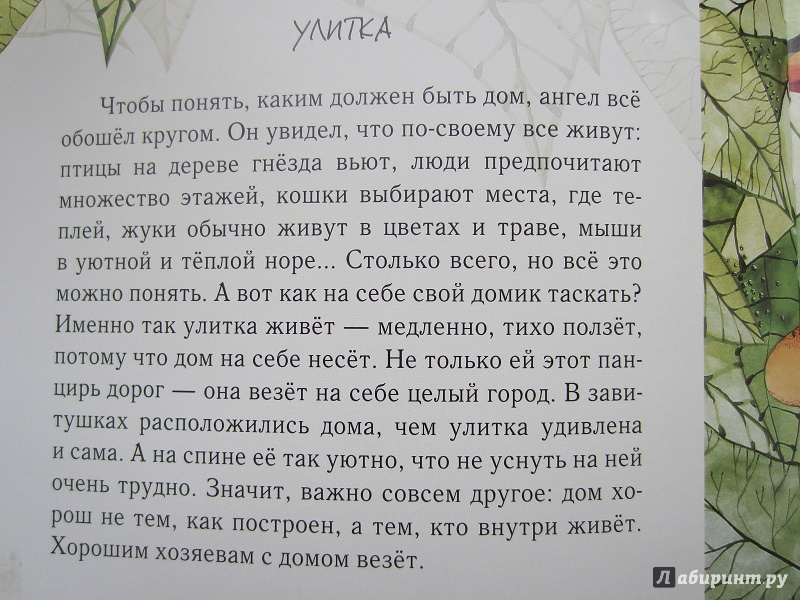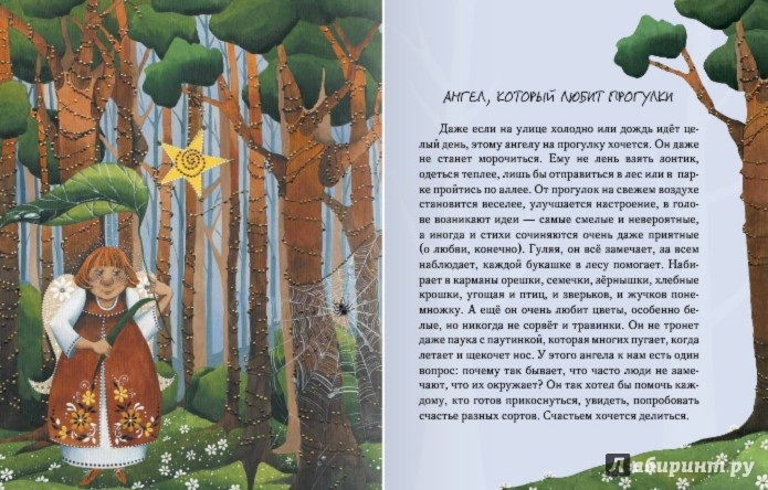 Приятная, милая книга. Лирические миниатюры про ангелов вызывают улыбку, поднимают настроение. Это не проза. А "стихотворения в прозе". Везде есть рифма. Оформление книги, печать понравились. Для поднятия настроения взрослым и для разговора по душам с детьми, ведь в этих миниатюрах чудесные мысли!Сфотографировала одну крупно.