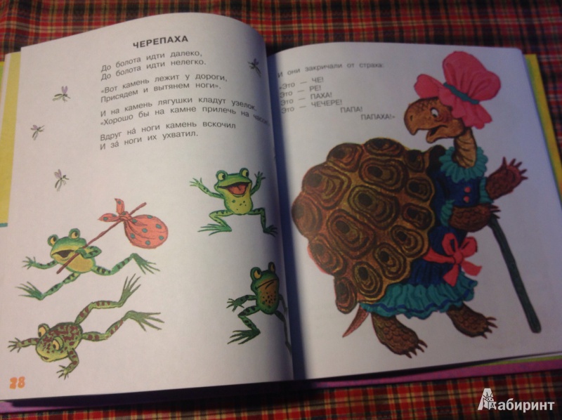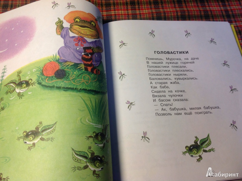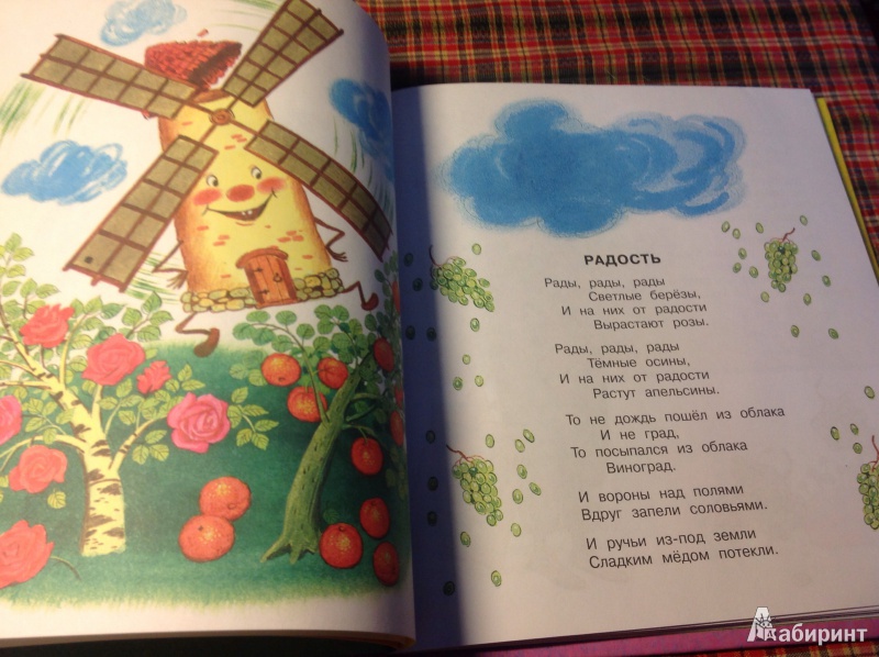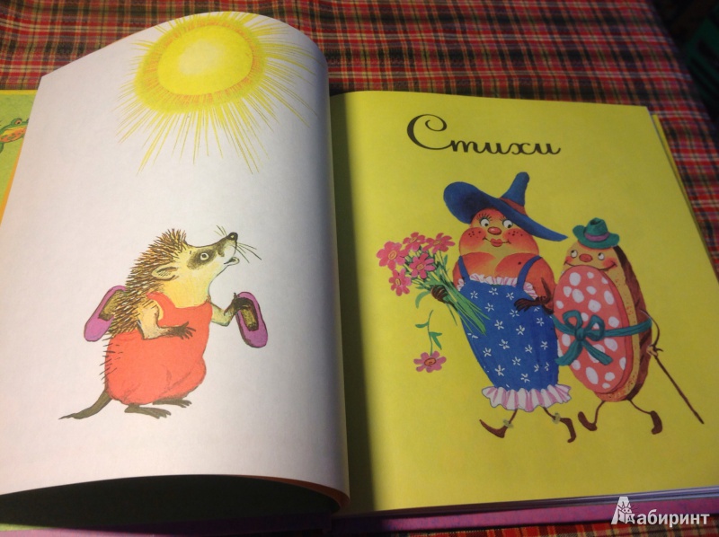 Размеры 21 на 21 см, очень хорошее качество полиграфии, качественно издана, иллюстрации прекрасные, очень обаятельные. Фотографировать не буду, потому что в примерах есть. Но - очень слабенький подбор произведений. Из известных там разве что про мурочку и про скрюченных человечков. Массу стишков я даже не видела раньше, и это не самое лучшее что Чуковский написал. Вот - английские народные песенки - хорошо, а загадки и отгадки, и просто стишки - так себе. Но - я рада что купила книгу, тк ее очень приятно даже просто рассматривать. Мой 2-х летний сын с удовольствием это делает.