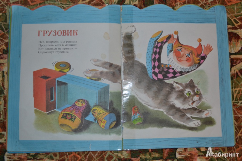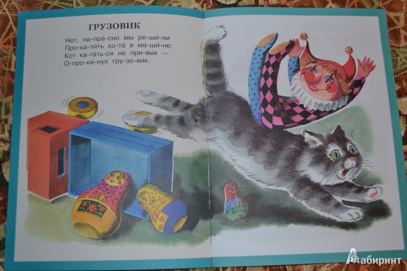 Когда я увидела эту серию книжек А. Барто, то не задумываясь приобрела. Объясню почему. На самом деле у меня есть эта книжка издательства "Малыш" 1998 г. выпуска и называлась она "Игрушки". Книга со временем истрепалась, некоторые листы пришлось подклеить. Рисунки Рудаченко в той, от 1998 г. замечательные. И в новой серии "Читаем по слогам" рисунки сохранены в прежнем виде. Только разница в том, что в книге стихи для детишек, которые учатся самостоятельно читать, с ударениями и слогами. Книга формата А4, тоненькая и в ней 5 стихотворений: