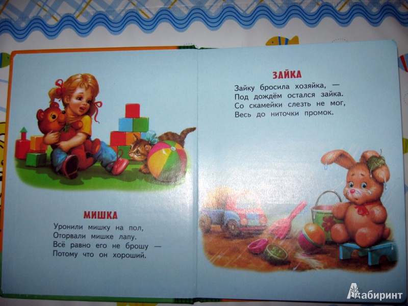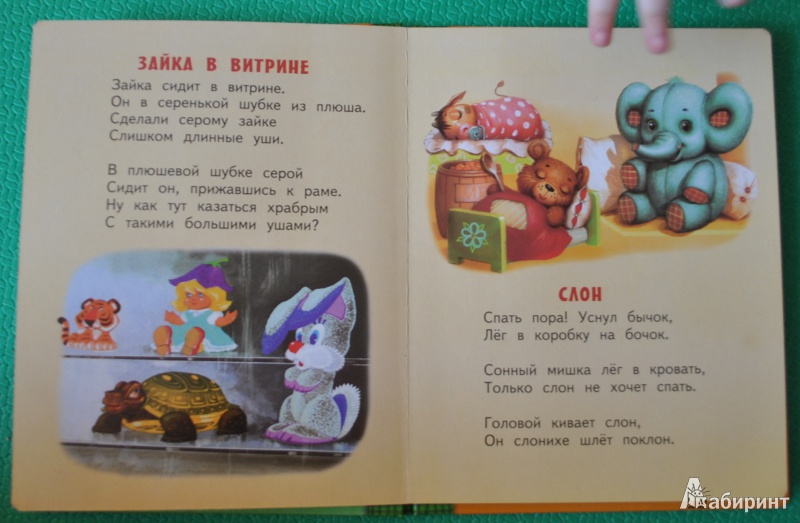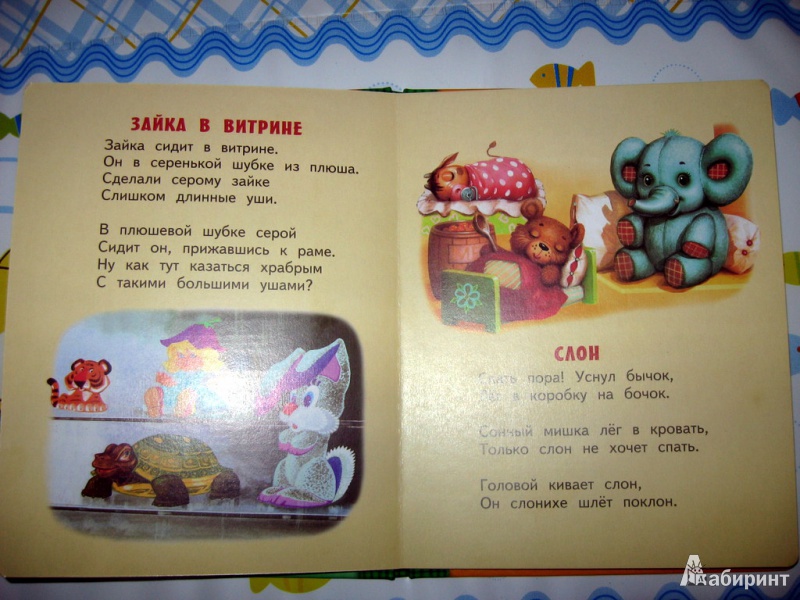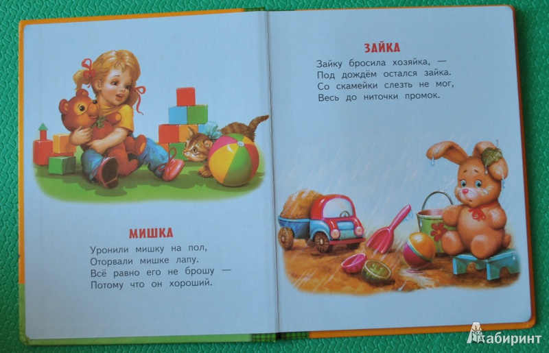 Иллюстрации к разным стихотворениям нарисованы разными художниками, поэтому они отличаются стилистически и это заметно. Но сами по себе иллюстрации хорошие, все животные и игрушки узнаваемы и очень милые, на картинках нет ненужных лишних деталей.
