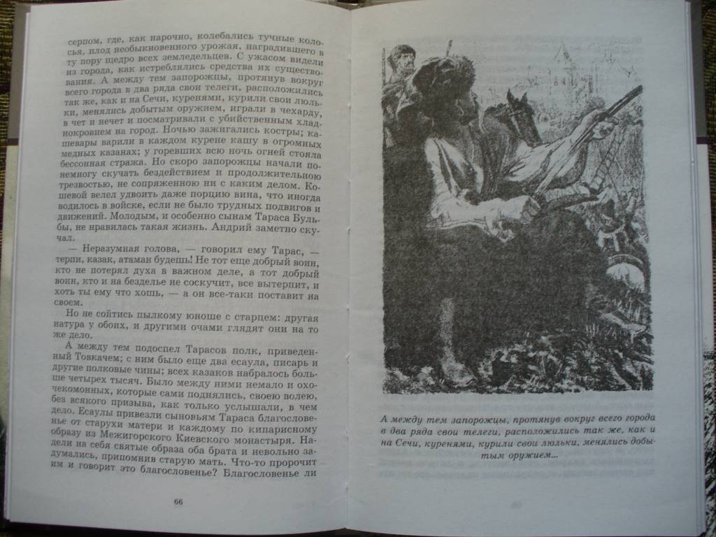 Прекрасное издание "Тараса Бульбы". Все как в серии, белая бумага, твердый переплет. И илстрации. Иллюстрации ставшие классическими. Лучше и представить себе нельзя. Колоритен и Тарас и вся Запорожская Сечь. Для меня странно, только то, что у Гоголя как то получается, что поляки все как на подбор рыцари, авот "козаки" как то "нерыцари". Нет в казаках деликатности, галантерейности. Пьют, бьют посуду и жену, валяются пьяными на дороге - хотя и распологают к себе и очаровывают, но се же тонкости в общении нет. А повесть действительно хороша и читается хорошо.