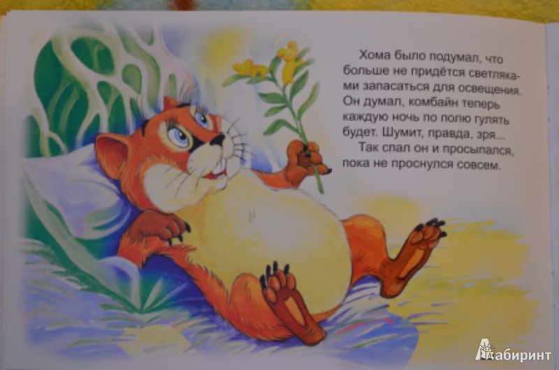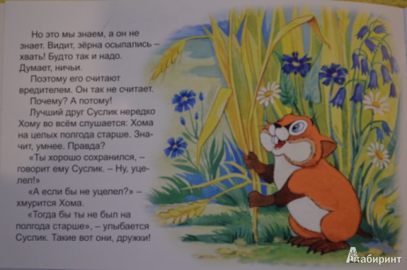 Первая книга из серии про Хому и Суслика. Плотная обложка, да и листы тоже плотные, глянцевые, но не бликуют. Иллюстрации на каждой странице, соответствуют тексту. Текст с юмором, не совсем для малышей.