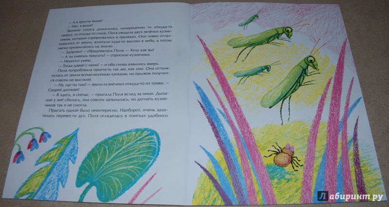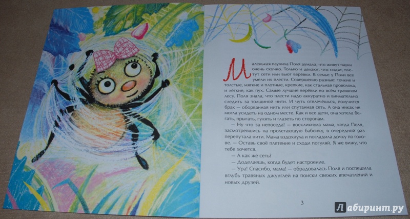 Симпатичная сказка про маленькую и очень любознательную паучиху Полю, однажды сбежавшую от обыденного плетения паутины «вглубь травяных джунглей на поиски свежих впечатлений и новых друзей».