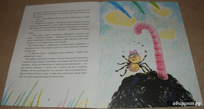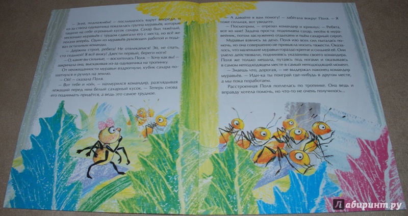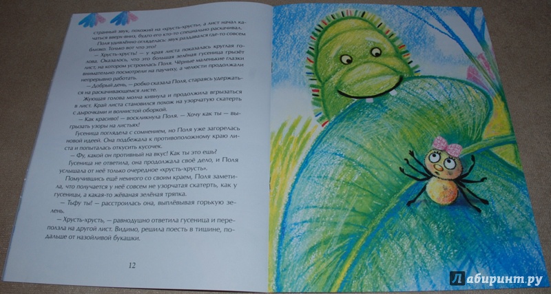 Очень милая, динамичная и поучительная история. Проиллюстрированная очень оригинально и интересно. Рисунки такие яркие, по-моему нарисованы мелками. насекомые очень узнаваемы, но при этом по-сказочному милы. Мы с сыном с удовольствием разглядывали каждую иллюстрацию.
