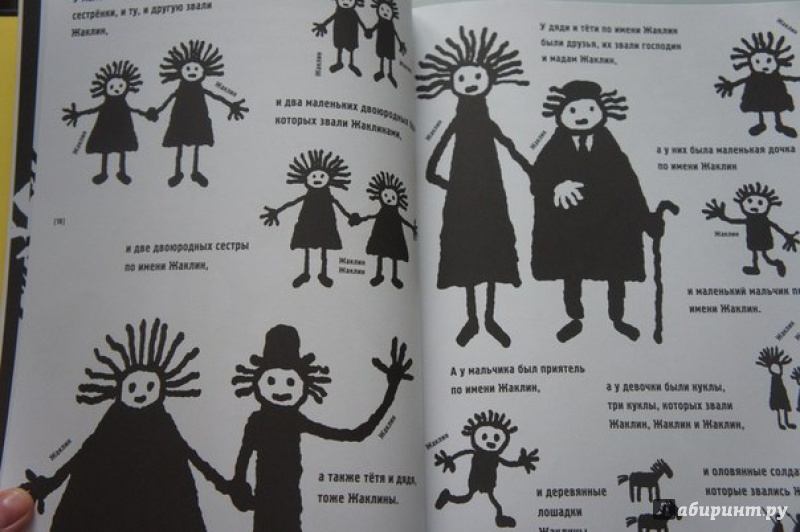И вот, у Вас возникает сказка, в которой ради экономии мысли все герои имеют одинаковое имя "Жаклин". Папа Жаклин, мама, а также трое детей - все Жаклин. Друзья и знакомые - тоже. Ничего не вижу в этом предосудительного и абсурдного! Простая идея произвела на свет Божий совершенно оригинальную, яркую сказку. Для нас с ребенком это было чем-то вроде грома среди ясного неба.