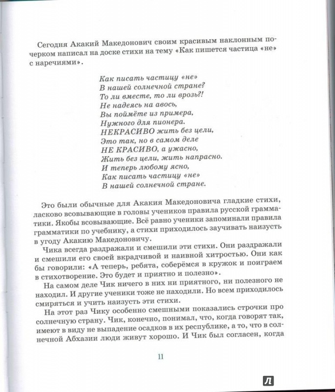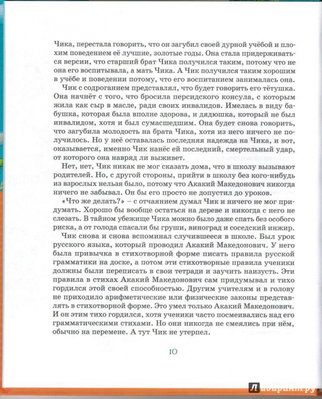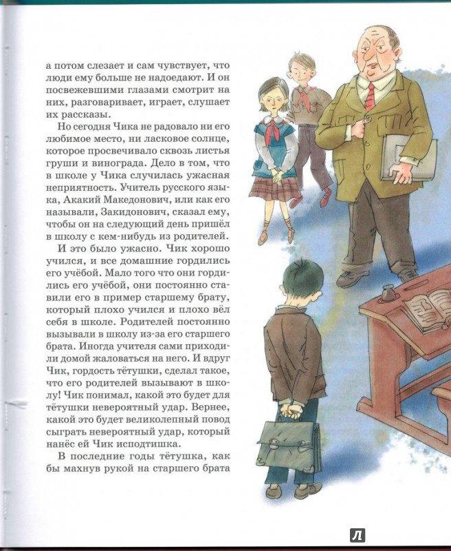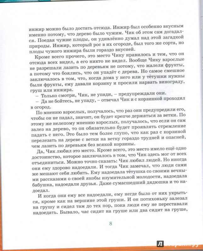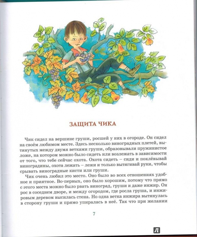 "Вообще Чику взрослые не разрешали лазить по деревьям не потому, что жалели фрукты, а потому что боялись, что он упадет с дерева. Но самое смешное заключалось в том, что, когда дома у него или у тетушки нужны были фрукты, ему давали корзину и просили нарвать винограду, груш или инжира.
