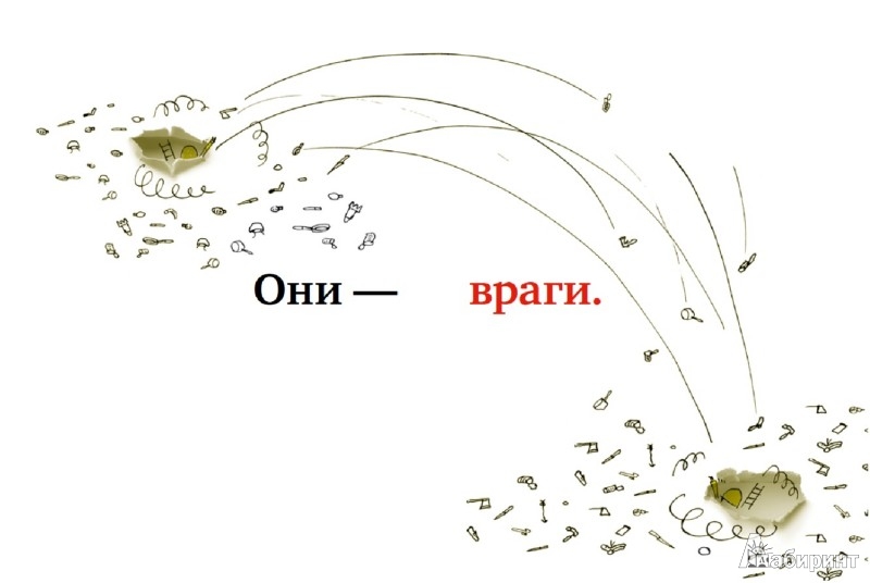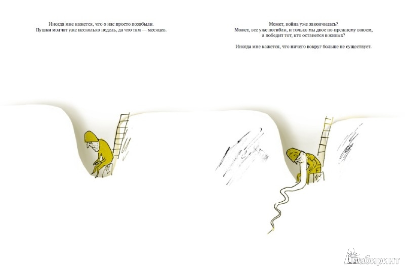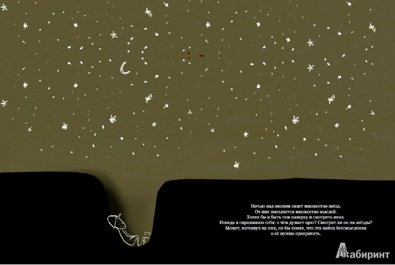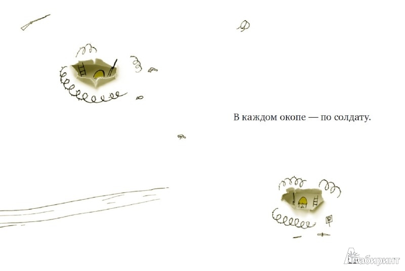 Очень хорошая книжка с редким взглядом на войну для детских книжек - примерно как "только пыль, пыль, пыль, и нет сражений на войне". Два одинаковых солдата сидят в симметричных окопах и думают, какой ужасный и жестокий у них Враг. А потом попадают в окопы друг друга и видят, что они симметричные, человечные, у них есть семья и одинаковые витаминные батончики про запас - и что у обоих есть одинаковые методички, в которых написано, как ужасен и жесток их враг. Оба мечтают о том, что тоскливая война закончится - а про них, похоже, забыли. Очень хорошая книжка. думаю, дети ее сами должны читать. Я очень рада, что купила ее.