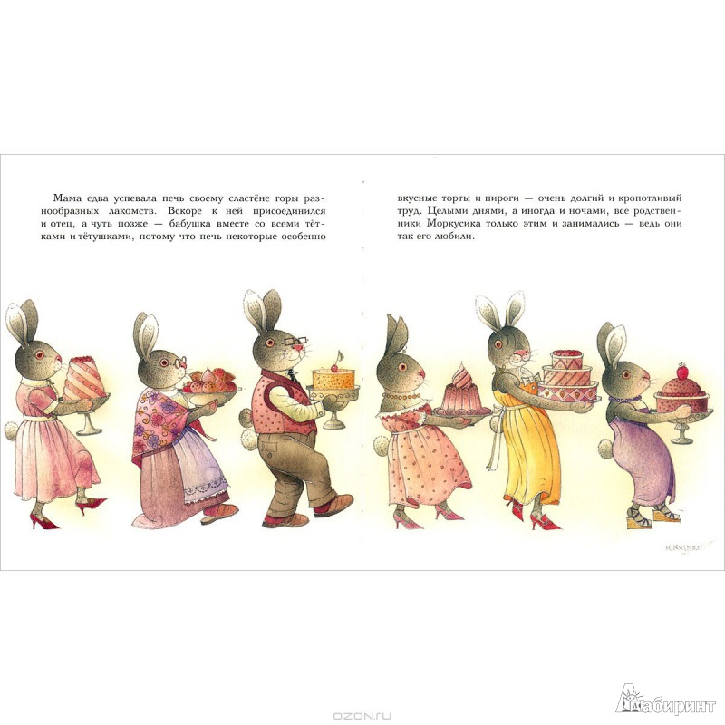 Сначала торты и пирожные готовила зайчонку мама, потом подключились все заячьи родственники, но аппетит Моркусика всё увеличивался, да так, что пришлось заказывать сладости на дом - их доставляли теперь ежедневно специальным фургоном из Центральной пекарни.