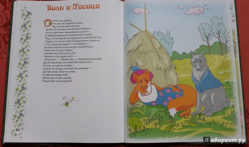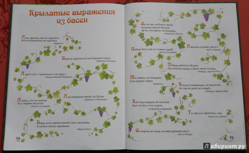 Впечатление от книги спорное. С одной стороны отличное содержание, расположение иллюстраций и текста (слева страница с текстом одной целой Басни, справа на странице иллюстрация), краткая биография с портретом писателя, крылатые выражения из басен вынесены в конце книги и красиво оформлены (ну, на мой взгляд).