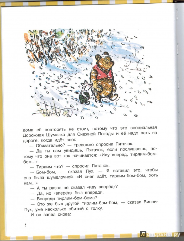 В двух томах как и задумал Милн. Поэтому каждый том имеет адекватные габариты и вес. Страницы очень толстые, шрифт отличный. Классические иллюстрации, в которых Шепард срисовал героев с сына автора и его и игрушек. Классический наилучший перевод Заходера.