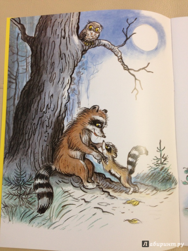 Есть в этом некоторая недосказанность. Поэтому мой сын раз за разом во время прочтения громко восклицает: "Это было всего лишь отражение! Мама сказала ему, что это было только отражение в воде!" и радостно смеётся. В общем, книжка очень добрая, забавная и интересная. И очень хороши иллюстрации Сутеева: на его рисунках изображён такой красивый, сказочный лес, сразу видно, что действие происходит ночью, но при ярком свете полной луны. И зверята невероятно милы, как всегда у этого художника...