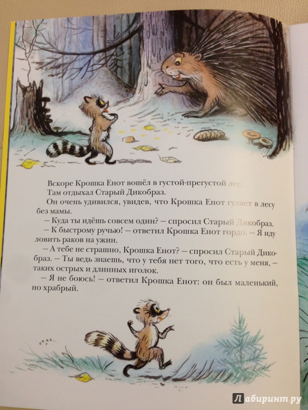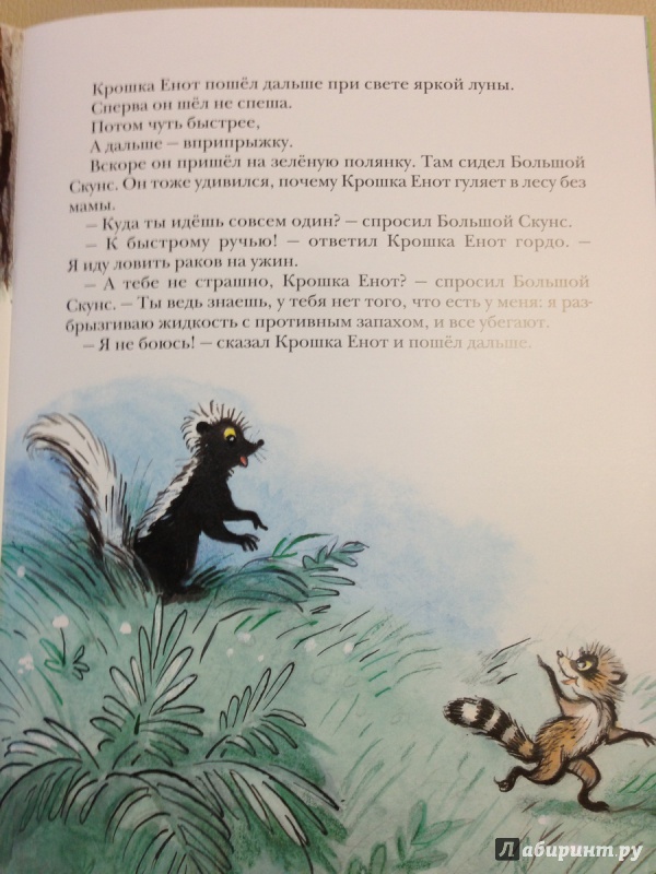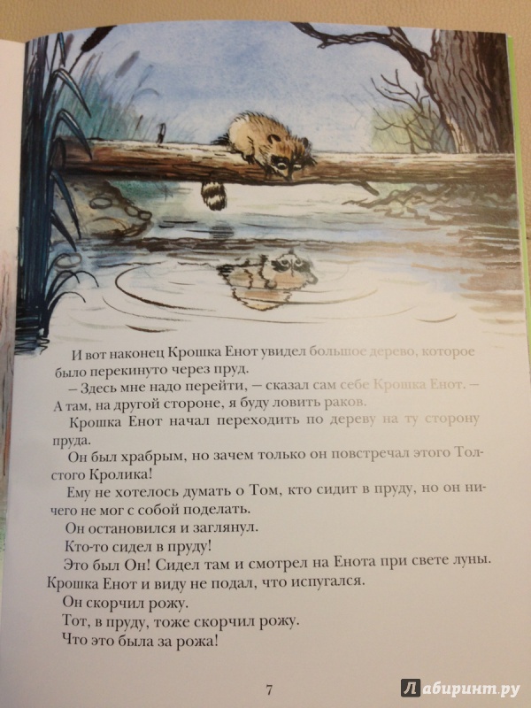 Замечательная книжка со всеми любимым сюжетом. Конечно, большинство знает "Крошку Енота и того, кто сидит в пруду" по одноимённому мультфильму, но на самом деле это была лишь экранизация сказки Лилиан Муур. История о Еноте в книжке пестрит новыми подробностями, например, в мультике у крошки Енота день рождения, и он отправляется к пруду за сладкой осокой к ужину. А в книжке мама просто просит крошку Енота принести на ужин раков из пруда, раз уж на небе такая полная и светлая луна, а значит в лесу светло и не страшно... Но тем интереснее детям читать книжку, когда сюжет в ней совсем другой...
