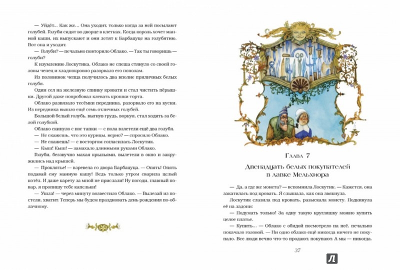 Чудесная сказка Софьи Прокофьевой в особых представлениях не нуждается. А вот об этом издании стоит рассказать подробнее. Обложка декорирована выпуклым тиснением, плотная белая мелованная бумага, очень сочные яркие цвета - лимонный, фиолетовый, бирюзовый, малиновый... Крыши домов волшебного города радуют разноцветной черепицей, а хулиганистое Облако на каждой странице предстает в новом обличье (в точном соответствии с замыслом автора). В книге много иллюстраций на всю страницу, есть и иллюстрации на разворот. Каждая глава открывается "шапкой" с рисунком. Иллюстрации Калиновского, возможно, "на любителя" - он непрост и затейлив. В его рисунки хочется вглядываться, искать в них все новые детали.