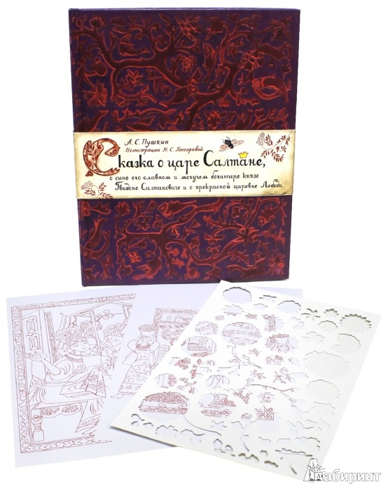 В последнее время люблю издательство "Лабиринт Пресс" ещё и за то, что практически в каждой книге у них есть сюрприз. Вот даже казалось бы: классика, Александр Сергеевич Пушкин. Да ещё и иллюстрации мастера такого высокого уровня, т.е. не какая-нибудь развлекательно-увеселительная книжка с наклейками, а всё равно придумали, что к ней приложить. Три иллюстрации с контурами картин Гончаровой, которые можно раскрасить на свой вкус и в своём стиле, а ещё трафарет с орнаментами Гончаровой, используя который, можно создавать свои узоры. Сожалею только о том, что трафаретов всего три – хотелось бы попробовать разукрасить их в разных стилях и не только ребёнку, но и самой. Уже их отсканировала и распечатываю, когда ребёнок просит - но на оригинальных раскрасках из книги рисовать было лучше. :)