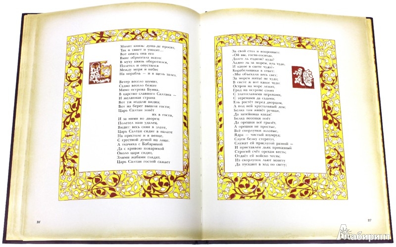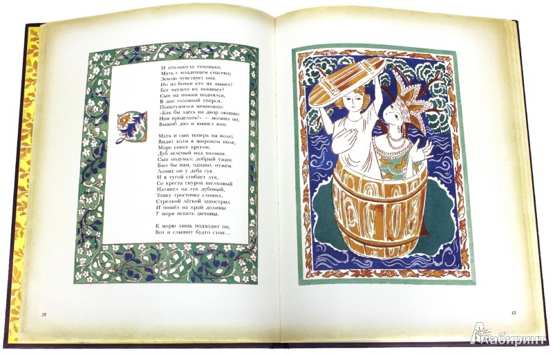 Книга великолепная! Знакомство со сказкой начинается уже с обложки: выпуклый рисунок - словно корни деревьев в волшебном лесу. Дальше - больше. Иллюстрации великолепные, цветопередача - хорошая. Единственный "минус" - текст в конце многих страниц обрывается неожиданно. Например, на стр. 19 начинается фраза "Видит: весь сияя в злате", а конец фразы - уже на 20-й: "Царь Салтан сидит в палате". Ритмический рисунок стиха нарушается. Во всем остальном книга вызывает только чувство восхищения.