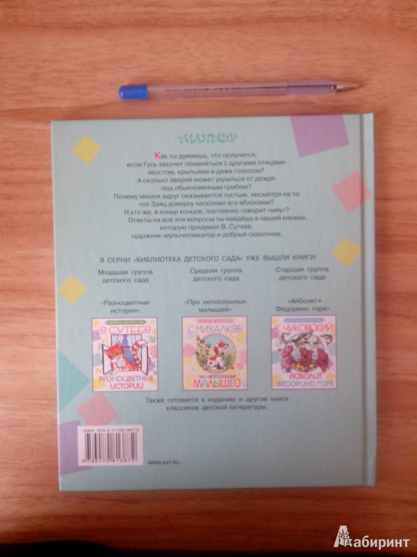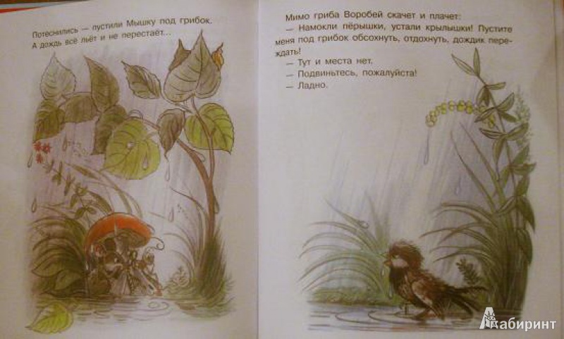 Очень удачная книга! Прекрасный формат - не слишком большая, не тяжелая. Всего три истории ("Под грибом", "Это что за птица?" и "Кто сказал мяу?") - удобно прочитать за один "присест". Книга вообще очень ладненькая, ее приятно читать и просто приятно держать в руках. Иллюстрации крупные и интересные. Про качество иллюстраций даже говорить не хочется - это Сутеев, и этим все сказано.
