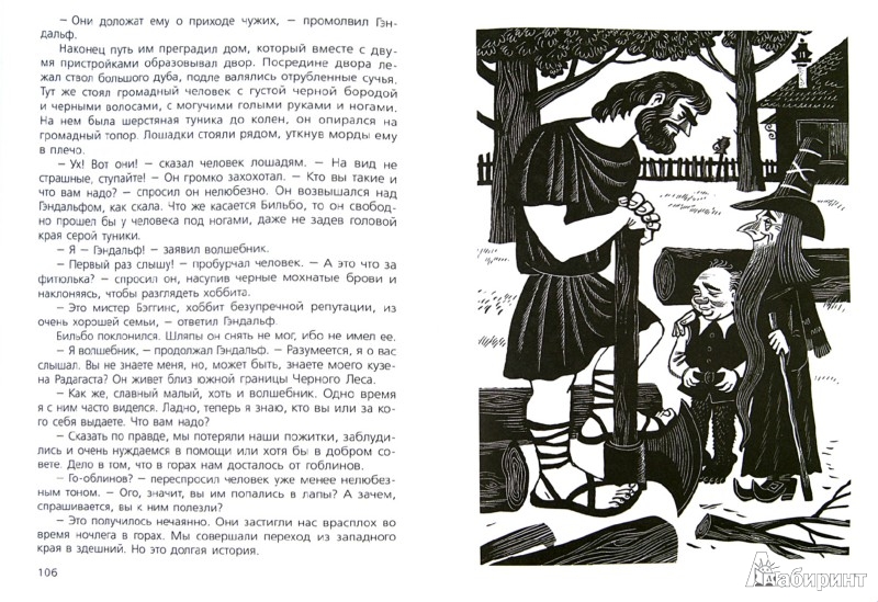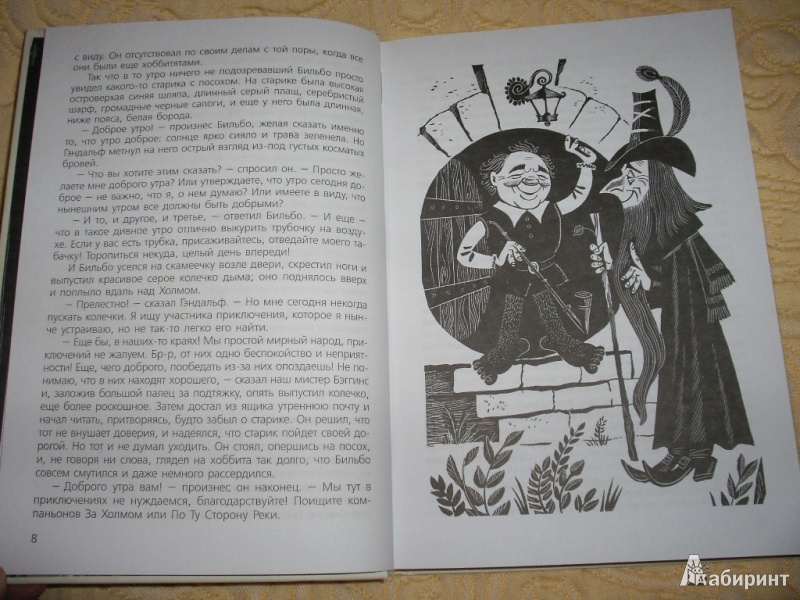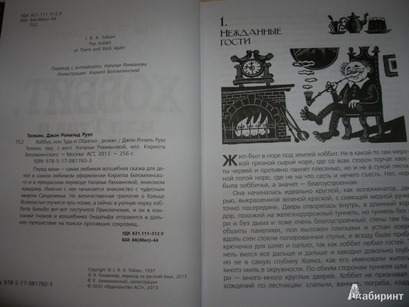 Вот и сбылась моя заветная мечта: издательство «АСТ» выпустило книгу «Хоббит или Туда и Обратно» в классическом (и самом увлекательнейшем, по моему убеждению) переводе Н. Рахмановой! Честно говоря, я бы купила книгу с этим переводом и без иллюстраций и на газетной бумаге и в мягком переплёте! Но издательство переиздало книгу советских времён с замечательными чёрно-белыми иллюстрациями М. Беломлинского! Да-да, теми самыми, на которых Бильбо Бэггинс похож на актёра Е. Леонова, а волшебник Гэндальф — на актёра Р. Плятта! Совершенно неожиданный новогодний сюрприз от «АСТ»!