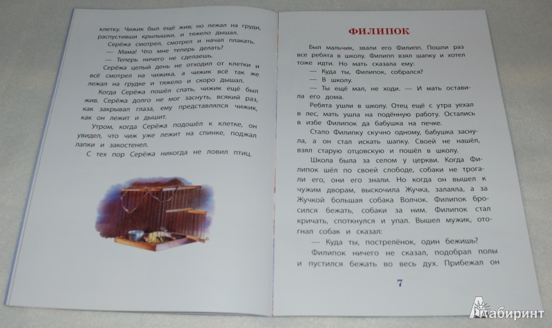 В этот небольшой, всего 16 страничек, сборник вошли 4 произведения Льва Николаевича Толстого: 3 были – «Птичка», «Филипок» и «Косточка» и рассказ «Черёмуха».