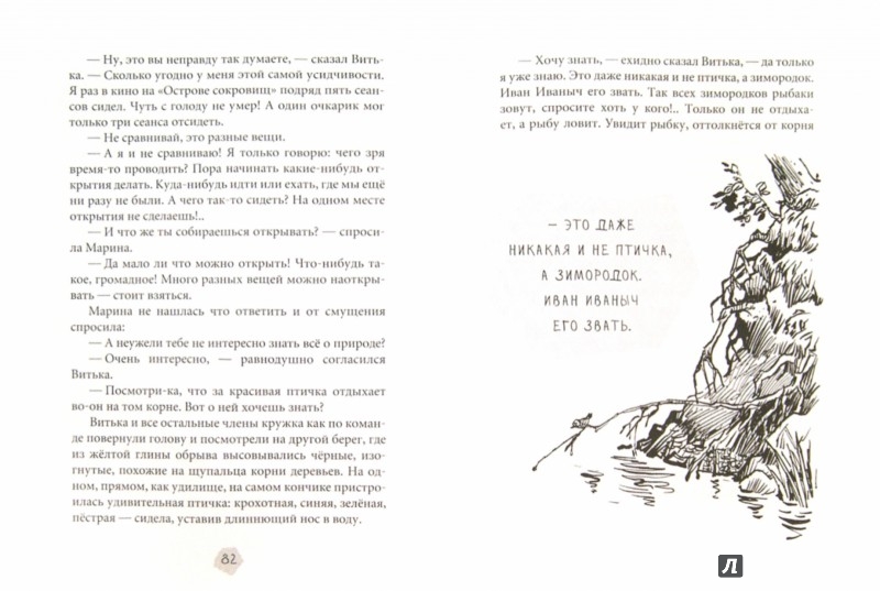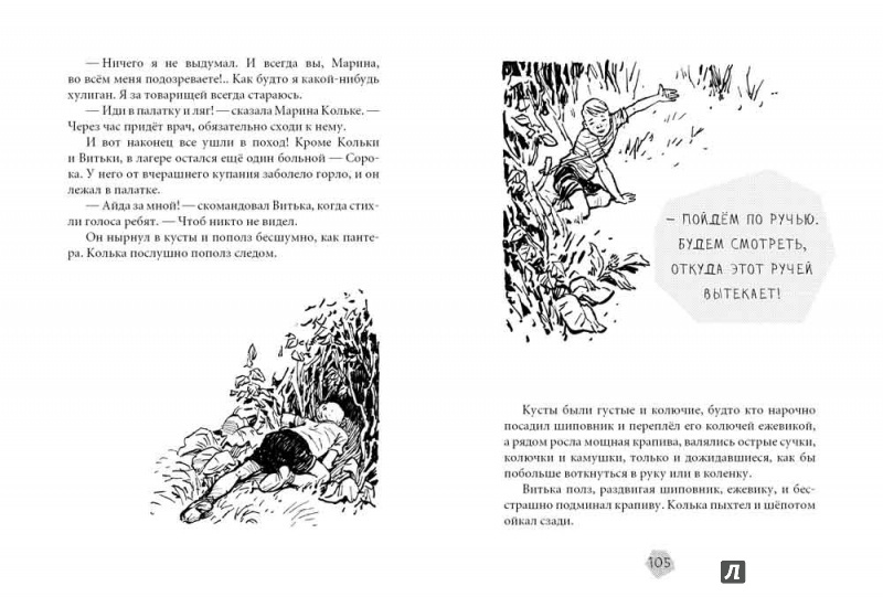 "Витька нагнулся к ручью и опустил в воду чайник. Если сильно сощурить глаза, то получится, что ручей — это большая река, а кусты по берегам — непроходимый тропический лес...