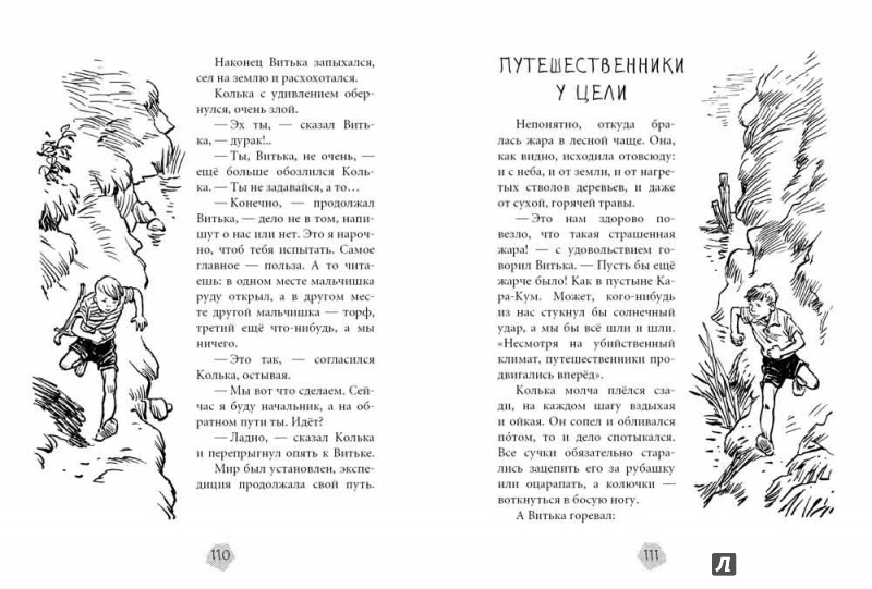 "Такие эти облака интересные: как горы. Среди пустыни — горы. А по горам карабкается неутомимый исследователь и знаменитый путешественник Виктор Иванов. Ростом он в три раза больше теперешнего Витьки. Голос у него грубый от ветров и холода. Он не в трусах, у которых то и дело сползает резинка, а в костюме из кожи оленя, на ногах — высокие сапоги, подкованные шипами. На шее висит бинокль, за плечами — автоматическое ружьё, заряженное пулями. За поясом — сабля. Усы и борода у него точь-в-точь как у путешественника Миклухо-Маклая. Сзади бежит учёная собака. Даже не собака, а приручённый волк, громадный, как тигр! Ага, вот и сам тигр ползёт за ним следом, извивая хвост и кровожадно выпустив когти.