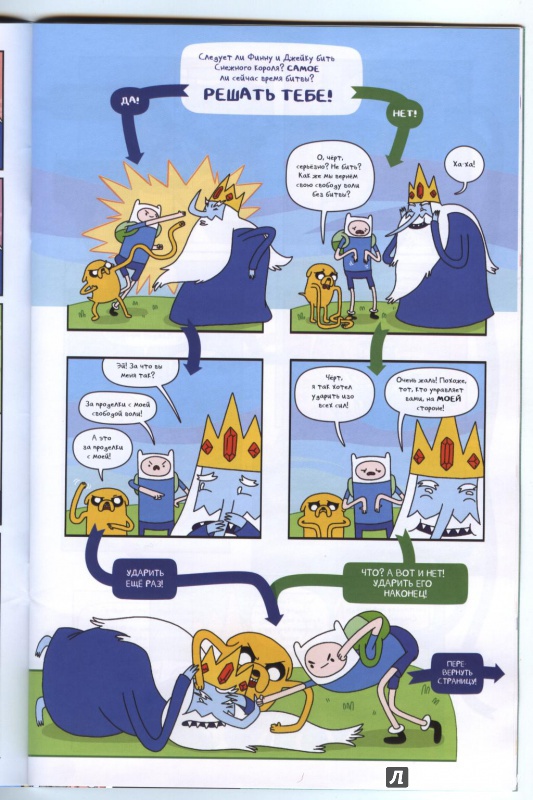 Вы когда-нибудь мечтали надавать Снежному Королю по наглой роже? Или может вы хотели подружиться с ним? А может вы хотели закопать его в песок а потом сбежать? Или сыграть с ним в тенис? Чтож, если вы - фанат мульта "Время Приключений" то этот выпуск для вас! На каждой странице этого номера вам предстоит самому выбрать действие, которое будут выполнять главные герои, и в зависимости от этого изменить саму истотию! Историю этой книги!