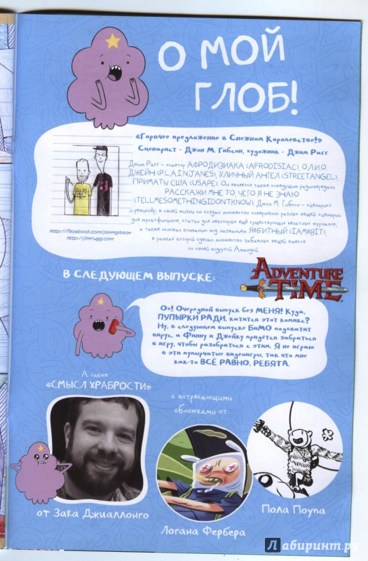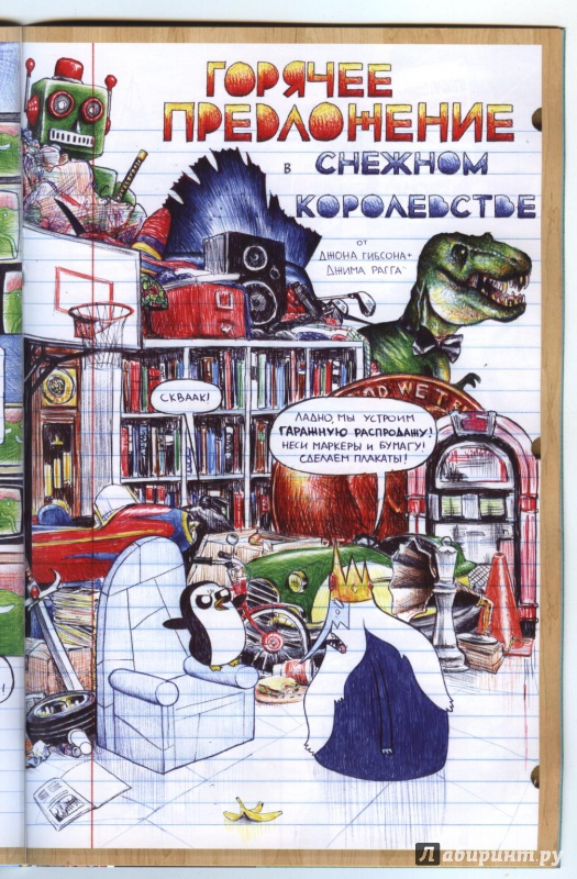 Но и это еще не все! Во всех выпусках серии "Adventure Time" помимо основной истории издается мини-история от разных людей. В этом выпускеэто комикс "Горячее предложение в Снежом Королевстве!" от сценариста Джона Гибсона и художника - Джима Рагга. Сюжет таков - Снежный Король совсем запустил свою корону - она ни разу не мытая с тех пор, как он ее надел, поэтому он собирается купить чудо-полировщик, чтобы ее отчистить, но места в замке не хватает, поэтому он вместе с Гюнтером устраивает распродажу всего своего хлама, чтобы появилось место для чистящей чудо-машины, даже устройства судного дня!
